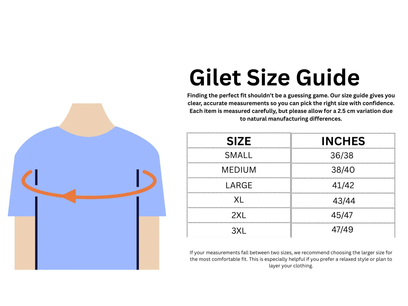 Size – Small 36/38,Medium 38/40, Large 41/42, XL 43/44, 2XL 45/47, 3XL 47/49, 4XL 50/52, 5XL 53/55